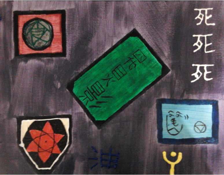 For this marking period i decided to paint something that i loved, Japanese Characters. Specifically from anime (Japanese Cartoons). The anime i choose was Naruto. It's interesting to me how a single miss placed brushstroke or one too many could make the character mean something entirely different. The characters in the blue box stand for nin-dog (Ninja-dog) and Jashin (A type of religion). The ones in the green box stand for