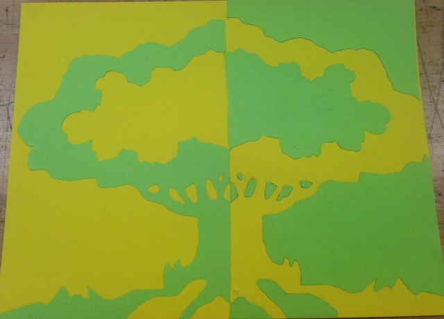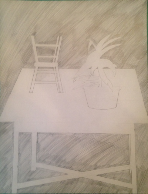 B. I found the negative space in the cutout with the base paper after I cut out the traced template that was in another color. I found the negative space in the still-life when I was drawing only the outside lines of the objects and shading in the empty spaces.