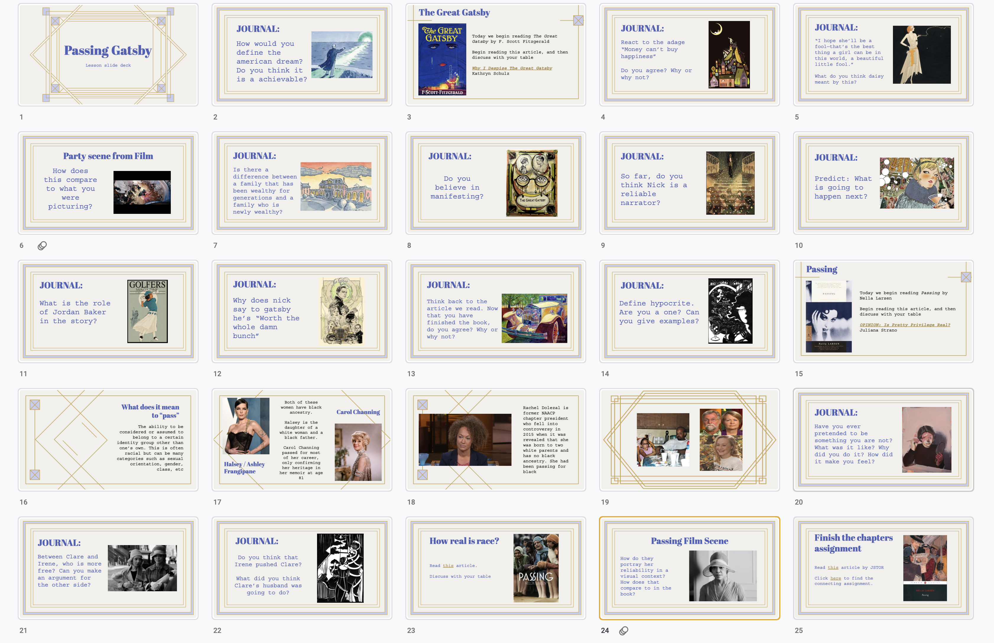 In the future, my goal is to teach students, specifically highschoolers, an English curriculum. Because of this, I wanted to put myself in the shoes of a teacher in order to better prepare myself. For my Capstone project, I created mock lesson plans as if I was an English teacher. I created two main units based on my own interests. One of them is called Passing Gatbsy, in which the unit is based around the books Passing by Nella Larsen and The Great Gatsby by F. Scott Fitzgerald. The other is a Cinema Studies unit, which works as an abbreviated introduction to film course. I started with an inquiry into teaching in a way that was creative, engaging, and effective. I also wanted to explore how to incorporate film into an English classroom, as I am a CTE DigVid student, and film is a passion of mine. I figured that the best place to begin my research was all around me, interviewing my own teachers as guides. From there, after conducting my own research, I began to assemble my lesson plans. Each lesson plan, done in a UBD (understanding by design) format, contains several links to resources that I created or curated for the course, including relevant articles, project descriptions, and slide decks.