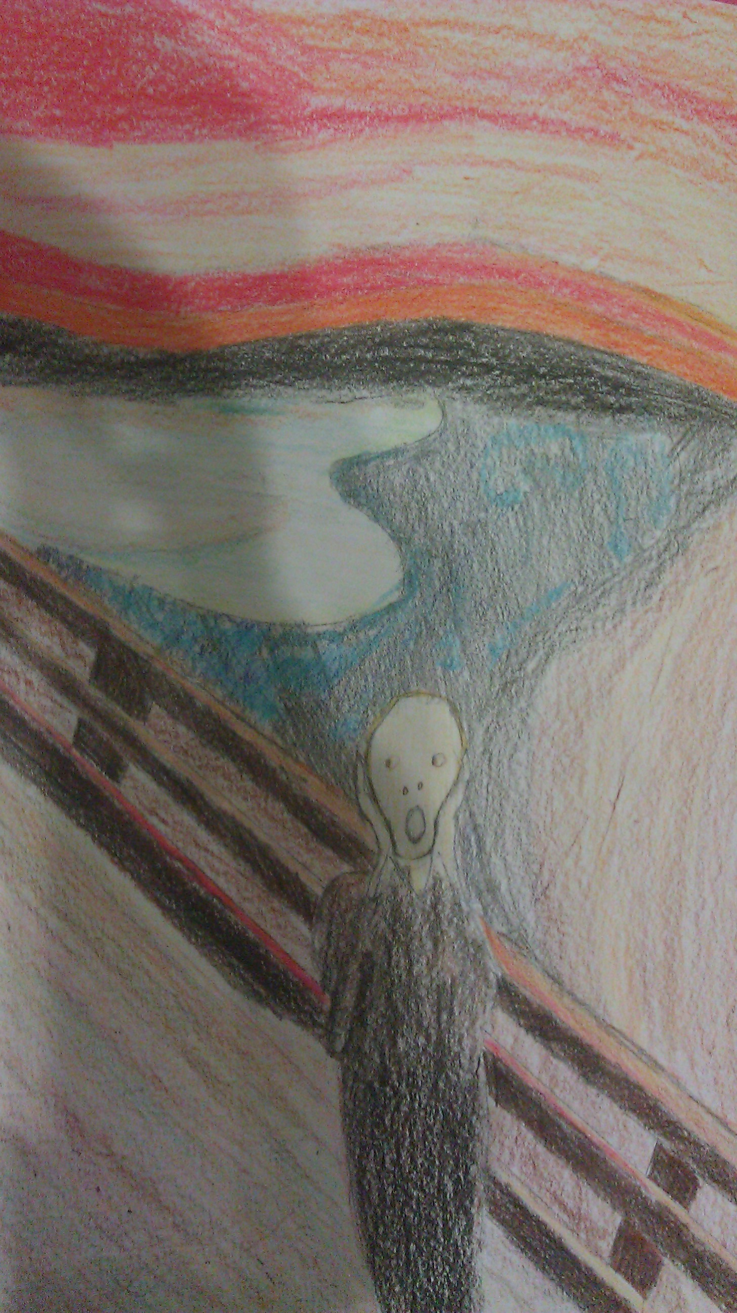 For my internet sculpture I made a robot box. I got the idea from the wallpaper I had set on my phone and checked online if there was a specific process I was supposed to follow. It was fun to make the robot box, even after I was done and knew I didn't need it I still kept it and used it for all kinds of things. For "Copy a master" I did The Scream by Edvard Munch and when I first saw it it caught my eye. Not just the guy screaming at the center of the art piece but the colors behind it, everything that was going on that most people wouldn't notice. Though my recreation of the art piece wasn't 100% exact you still have the same situation with the color going on, which is what I was mostly concentrating on more then making the guy seem familiar to the real one in the painting.