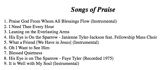 Track 1: https://dl.dropboxusercontent.com/u/2270671/JHinton-Capstone/Album-Music/Praise%20God%20From%20Whom%20All%20Blessings%20Flow.m4a