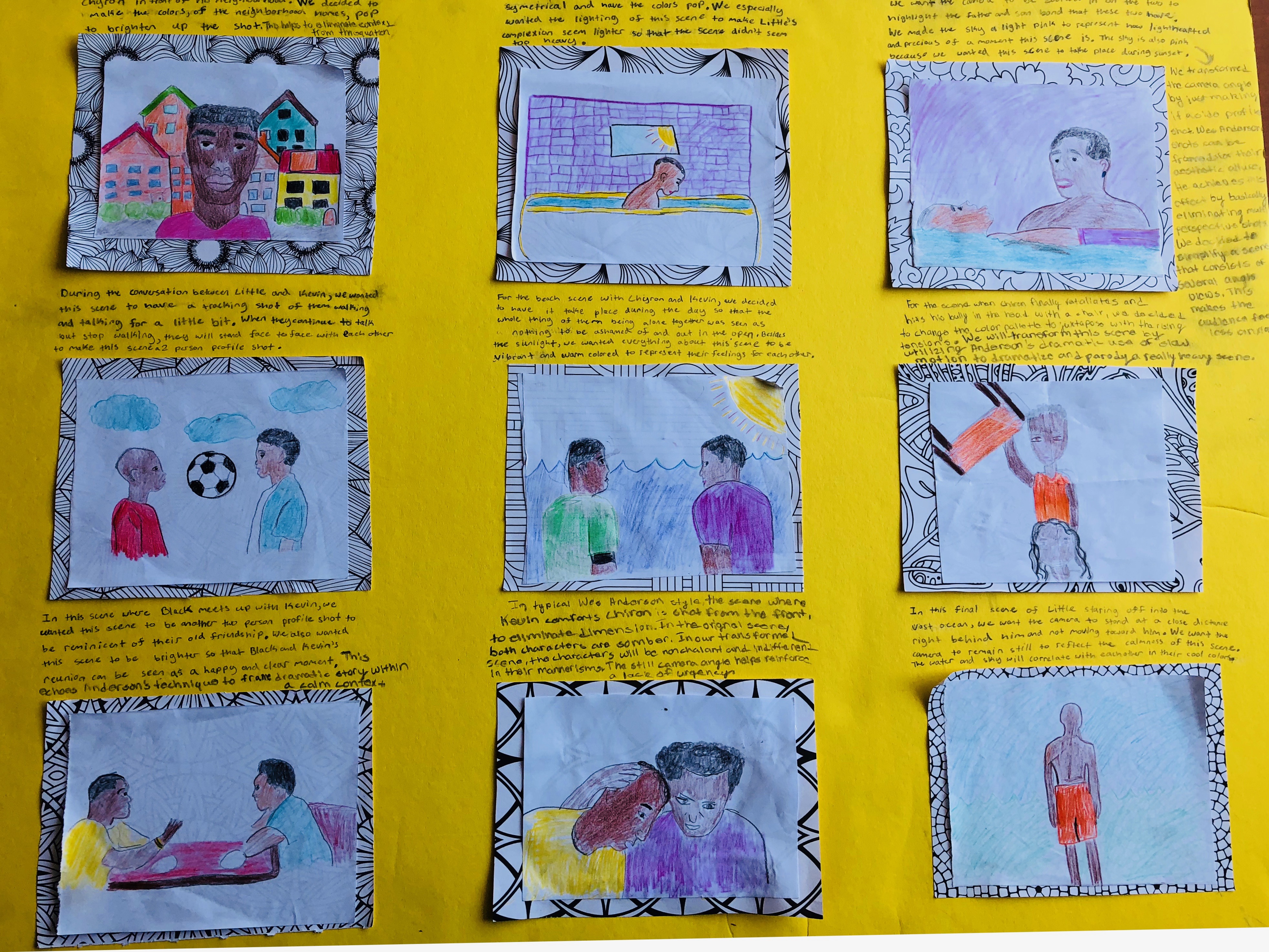 For our project, we decided to recreate scenes from the movie “Moonlight” using the film and style techniques of director, Wes Anderson. Anderson is an indie movie director who’s most well known movies include “Isle of Dogs”, “The Grand Budapest Hotel”, “The Fantastic Mr. Fox” and “Moonrise Kingdom”. Throughout all of his movies, Anderson’s directing style stands out very vibrantly in tone and theatrics. Some recurring cinematographic elements of Anderson’s style include tracking shots, zoom, profile shots, symmetrical framing, overhead shots and whip pans. Some of Anderson’s theatrical elements include warm and cool color palettes, non-diegetic plinking harpsichord music, one or more childish adult characters, smoking, characters explaining elaborate plans, action, violence, stylish attire, foreigners, a vintage/ old timey aesthetic, shots of writing, and an assortment of recurring actors and actresses. We chose to incorporate Anderson’s style to “Moonlight” because we loved the concept of revamping a dark toned movie into something more vibrant and lighthearted. To accomplish this goal, we chose some scenes from “Moonlight” that we thought had potential to be reiterated through Anderson’s directing style. We then looked at Then we drew these scenes and placed them in a storyboard panel. We also were deliberate in our camera angles and essentially eliminate dimensions to give our scenes a very “flat look”.