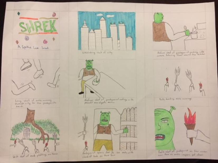For the re-creation to be successful the focus on Shrek being “colored”(green) would have to be amplified in this case and those attacking him would be remain white as they are in the film. This is shown in the storyboard by Shrek being quite literally the only colored character. The arms and legs of those in the mob are all white and colorless. Since Spike Lee is also known for limiting the information the audience has about those that aren't the main character, in the storyboard the only face shown is that of Shrek. The mob attacking him is represented solely by their footsteps and weapons, as those are the only things that add importance to them in Shrek’s life. Furthermore there would be the use of diegetic and nondiegetic sounds to represent the two different moods in the storyboard. When the mob is on the screen there is no background music, instead the rumbling of their feet, weapons, and the combined shouts of their voices will create the sounds that represent them. Shrek on the other hand will have an upbeat song playing in the background during his time on the screen, to symbolise the peace and tranquillity he is experiencing. The camera will rarely be still, as common for Spike Lee films, with it shakingly following the mob via dolly while gentle and smoothly following Shrek in his house cooking and eating. All this will be occuring in New York since all Spike Lee films occur in urban settings. Shrek’s house will be located at the bottom of a tree in a park to further solidify he is an outcast from this white society. The storyboard ends with the weapons belonging to the mob moving closer onto Shrek slowly, since Spike Lee commonly uses background music even in slow parts of his film there will be a sad song letting the audience know that Shrek is now at the mercy of the mob. Originally this scene takes place in the beginning of the movie and in this case it will as well, this will allow it to set the mood for the film and show the racial tension in the setting of the film.