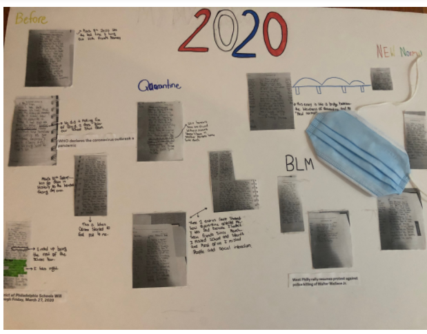 Creating this piece was such an amazing experience and a great way for me personally to reflect on this crazy year. My first step was to read through a journal I had kept, starting January 1st 2020 and writing in it everyday since. I decided on entries that I thought really reflected my 2020, entries from the day George Floyd was murdered by the minneapolis police, or the day I found out school shut down because of the Coronavirus, or starting high school online, and the last time I hugged a friend before quarantine. I took pictures of all of these entries and with my dads help printed them out, along with a few news headlines that I had found that I thought tied the journal entries together. After I had glued down my journal entries, in a format similar to a timeline of 2020 and added the news headlines I began to annotate my entries, seeing if any predictions I had were correct, and answering questions my past self had about the future, or really describing some of the things I had been feeling at the time I wrote the entry. The final piece I added to the board was an old mask of mine, with one of the straps connected to a headline I had written on my poster board, “new normal” because wearing a mask is the new normal, it’s something that I never leave the house without, so while certain things have gone back to the way they were before the pandemic a lot will never be the same. Being a teenager during this year was so hard in many ways. And I think that my project does a very good job of showing both the good, the bad, and all of my other feelings as a teenager in 2020. Keeping a journal this year was something that really helped me get through some of the bad times and emotions I was having. So I think to use some of those journal entries as the center point of my project really relates well to theme of being a teenager in 2020. During this year a lot has changed and I have had to adjust to a new normal of life, doing this project was such a good way to show all of my feelings and thoughts about this year, and to illustrate the good and bad.