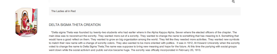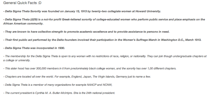 . "Delta Sigma Theta Sorority INC." Delta Sigma Theta Sorority INC. Delta Sigma Theta, 2012. Web. 11 May 2012. <http://www.deltasigmatheta.org/home.htm>.