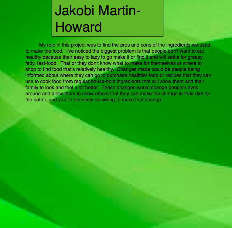 I feel so good about this project. We have spent a lot of time on this dance for the last week. Working in all class period and even staying after school to make sure our dance was polished completely. I feel very confident and comfortable doing this dance. Even though I feel this way I know that I will have some bubble guts to try to get over before the show. Something that I would have like to do different is choosing the songs. They are great for the project, but when looking back at it I know there where other songs that I could have chosen to use. I am very excited to perform this dance and hopefully everyone will be delighted to see our final piece.