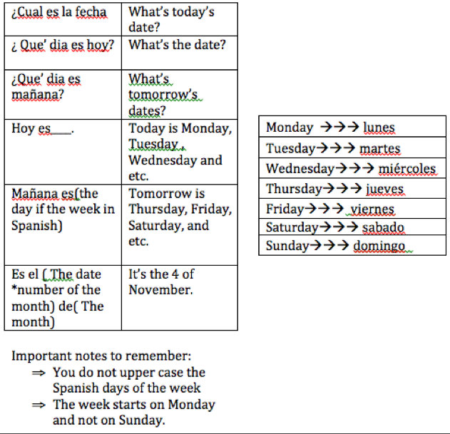 Down below the charts will help you understand the days of the week and how to ask questions about the week in Español.