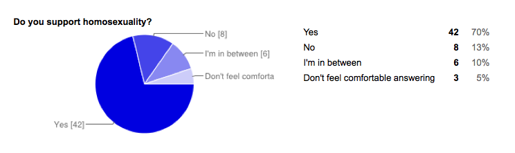 I initiated a majority of my student body to take some time and complete a survey asking them about their beliefs and opinions of homosexuality as a whole. From the results, many of them agreed with one another. And there were some who weren't afraid to express their true feelings. I do appreciate how everyone was very mature about the matter, it seems that they were all eager to get their thoughts out.