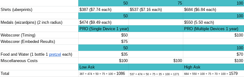 This is the original Braskem funding pitch. It features 3 separate funding levels, based on participation, for shirts, medals, food, water, and a timing system. This setup was based on Ethan’s pitch, allowing me to compare and contrast this year’s funding to last year’s during my pitch presentation. This also allows Braskem to get a better understanding of how their funding will be used based on how many participants show for the race.