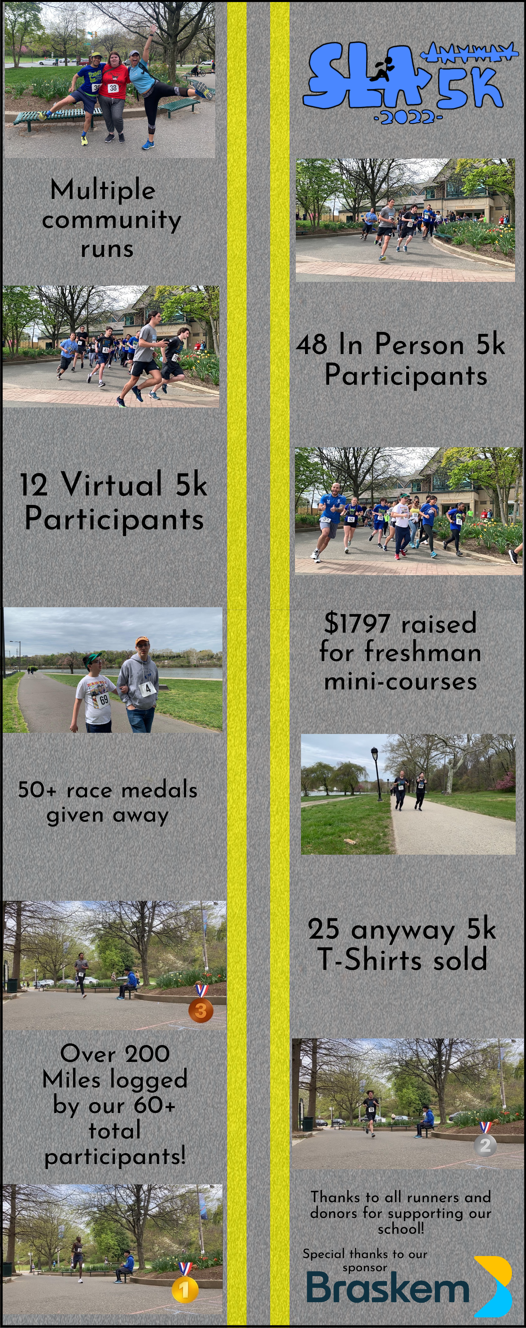 The SLA AnyWay 5k was started in 2020-2021 by Ethan Chen, a former SLA Students Run member. In hosting the second annual race, my hope was to establish the AnyWay 5k as a yearly event. To build off of last year’s race, I held an in person race in addition to the virtual event. I kept participation free in order to foster an inclusive and accessible race and, like last year, gave every runner who completed the race a medal. Money raised from shirts and donations went to the SLA Home and School Association, who will use it for freshman mini-courses next year. See the numbers below: