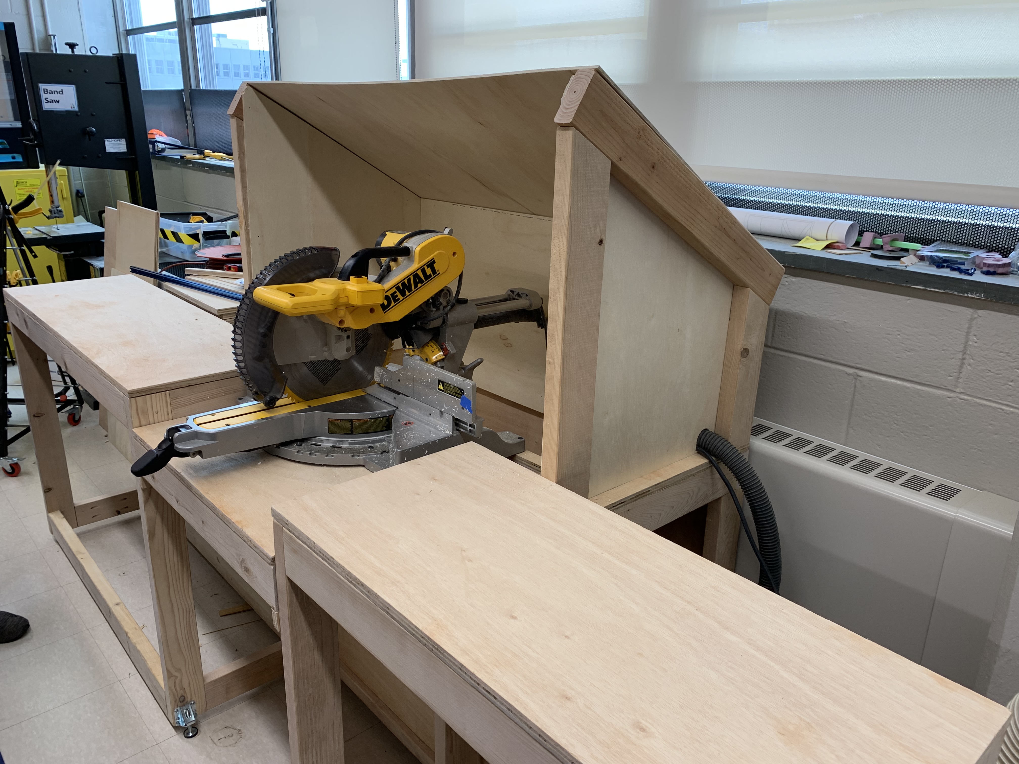 My capstone project is called The Dustless Chop Saw Table, which is almost exactly what it sounds like. If you don’t know what a chop saw is, it is a vertical cutting stationary saw used to cut individual sections of lumber and other commodities to length. In my opinion it is one of the most important tools in the shop, probably second to the drill press. Many of our projects require sections of wood, or foam which many times Kamal has us use the chop saw to cut our material. The table is around 10 feet long and 4 feet deep, very large, so I designed it in a way to have it slide in between a pillar and an air exchanger. It has 3 main parts, the left and right cutoffs and the dust hood. The dust hood is essential to keeping the dustless part in the name because it keeps all saw dust, foam particles and anything else from getting into the air exchangers and around the shop. The reason I am doing this is because Kamal needed a new setup for the chop saw, the stand for the saw was not helpful, it was loose and weird shaped. Kamal wanted something new, so I stepped forward. The process was extremely long, with many times I found myself not wanting to continue because it was so tedious or time consuming, but I powered through. With tons of material cut, and tons of hours it was complete.