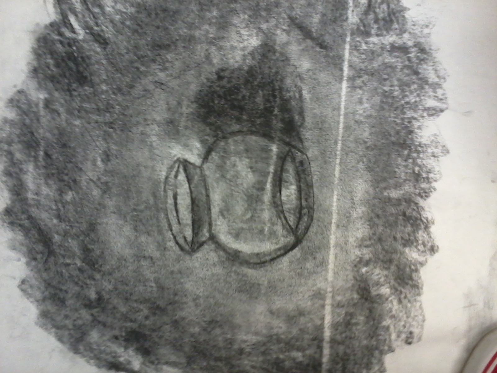 I had some trouble with the clear object drawing. It didn't really understand how to "shade" and make the object more 3D like. I started with covering the entire paper with the black charcoal and then faded the color to a lighter grey by taking a paper towel and lightly brushing the canvas. Next I proceeded to draw the outer edges of the vase. I tried my best to shade the picture to make it "pop" a little more, but I don't think I did a good enough job.
