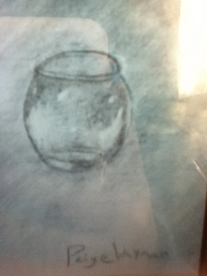 At first when I began the drawing, I drew crosses to make the circles. I did this because Emma told us that it would make our circles much neater than they usually are. Then after I drew the circles I started to draw the general shape of the glass. Doing these steps in this order made it easier to get an understanding of how the glass should be shaped in all areas. Then I began to shade. When I began to shade I started to do it really light and then I used the eraser to make the clearness of the glass, but as I was doing that I realized that not all of the glass is light. There are some dark, light, and white places, hitting the glass in all different areas. After realizing that, I erased the light shadings, and I turned my light shading into a dark shading, and when I found a place in the picture where there was some lightness included I took the eraser, and started canceling out the dark areas. Doing this project I figured that when having a light shading, then having to draw a dark one, seems more difficult to me. I prefer drawing a dark shading first, then start adding the lightness.