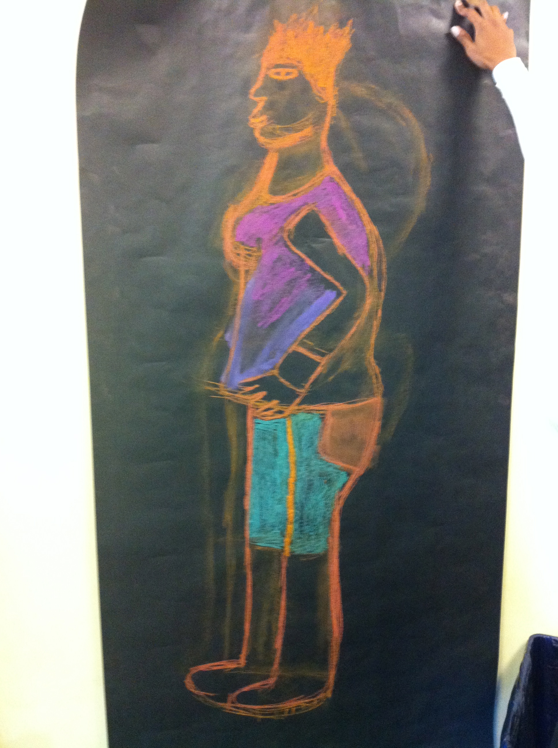 When starting this project I first watched Emma, to give myself some sort of starting position because there was so many places where I could’ve started, that all of a sudden I became lost. So, I first started with the head, and started to make my way down, and from there I started drawing the feet, the hands, the butt, and the legs. After the shape of the body was on paper, I started making the details, which was the structure of the face, neckline, the lips, the eyes, and the curving of the bust area. Then came the colors. I chose purple because I thought it would go well with the orange and I also just think that purple is a pretty color, which is why I merged light purple and dark purple onto the picture. I also chose the color blue, because I think blue is a fun color, and it is usually incorporated in all of my pictures. Doing this project I learned that when drawing a body, lightly draw the general shape first, and then start making curves, and edges, and neat patterns that would make the picture seem more real.