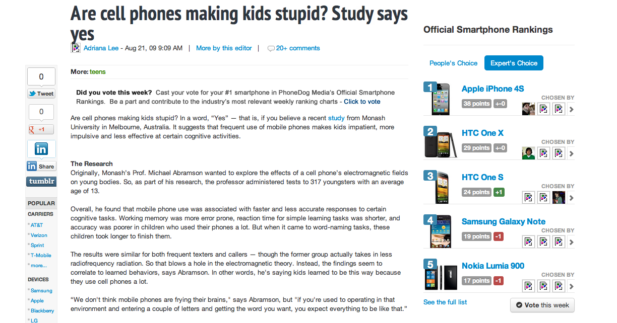 On a very informative website I noticed that they were advertising for cell phones as I was searching for how cell phones makes humans stupider.