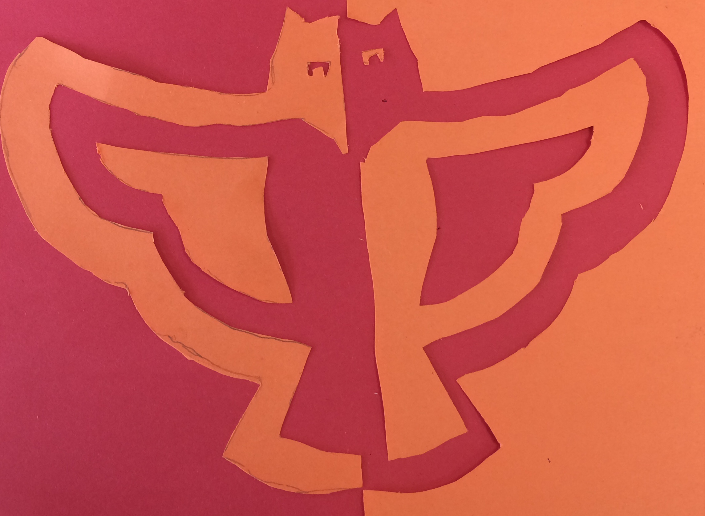 Negative space is a form of art where the background is in one color representing negative, and the rest of the drawing is in another color representing positive space. These colors can be flipped as well creating positive space in the background. In photos negative space can also be created by having the background of an image being blurry, while the point of focus is clear. The art style is somewhat simplistic, but have been used in many unique ways. The image I was cutting out and creating in positive/negative space was an owl. I decided the darker parts of the image would be the negative space, and the lighter parts the positive. After cutting these out into green paper, I layered the negative space cut outs on one side of the page and the positive on the opposite side.