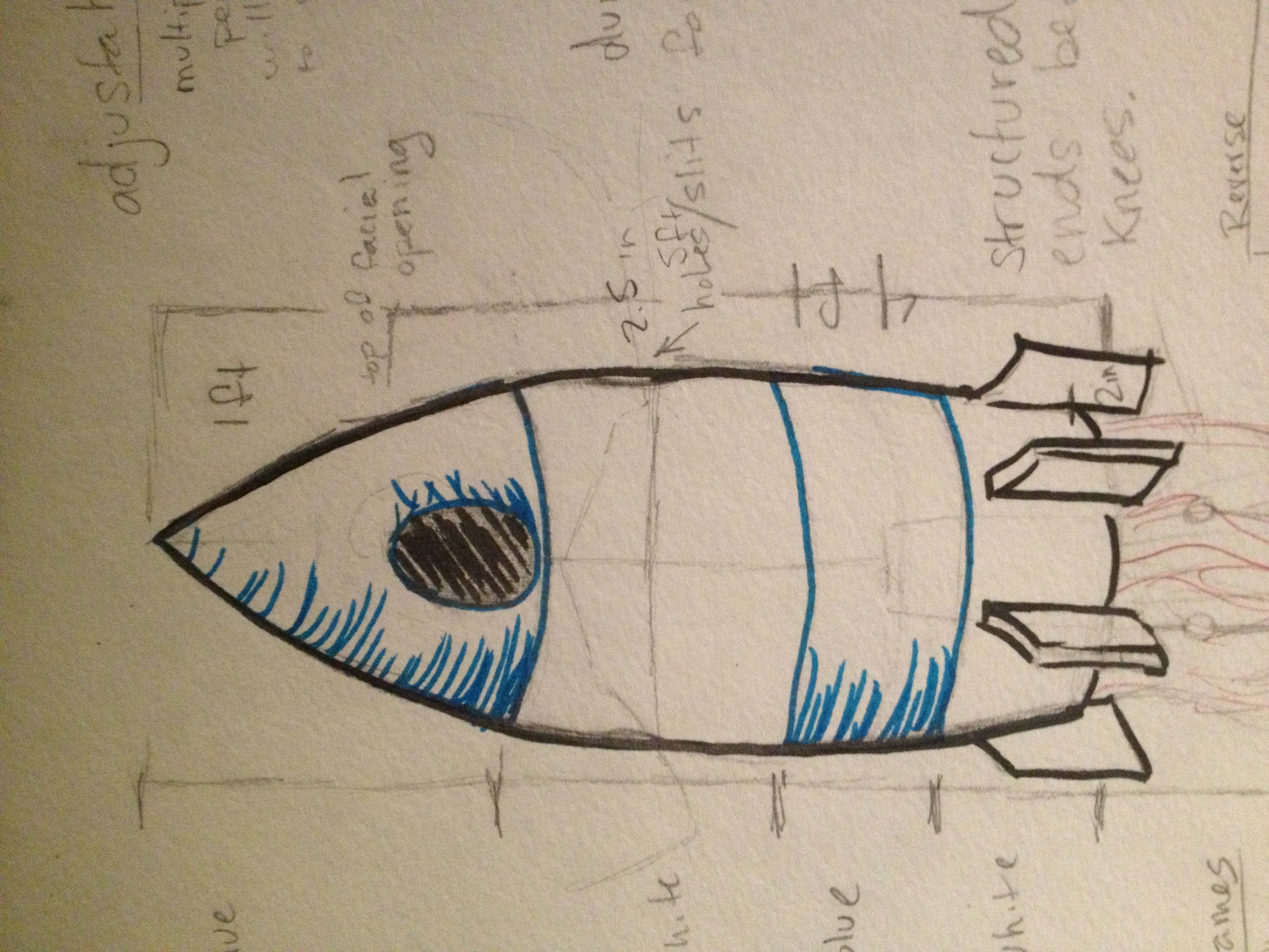 The scale model phase took approximately 6 weeks. This included, choosing the main material, deciding on a basic structure and sketching and building models. After being sure of the desired structure and material, I began assembling the pieces. This involved making paper outlines of each type of piece so that they would all be identical. These outlines would then be traced onto sixty gauge plastic which would then be cut out. The next phase was assembly. Almost all the pieces on the rocket are riveted together, only excluding the inner harness, which was screwed in after riveting. After the rocket was in order, I began making the flames and fins. The flames are different sized materials that are all cut and sewn to an elastic band which is Velcro-ed to the inner bottom rim. The fins are made of hard foam that was cut, shaped, sanded, and painted. After drying, they were glued on to the bottom. At this point all major construction sections were done, so I moved onto to details. All of the plastic on the rocket was originally silver but using spray paint, I was able to add the some school colors. Before painting, sections of the rocket had to be very securely masked off to cover silver sections and fins. Once the paint had dried, all that was left to do was add the decals. Simple brown glue was used to place the “S L A” and American flags on each side. This entire process spanned over 5 months.