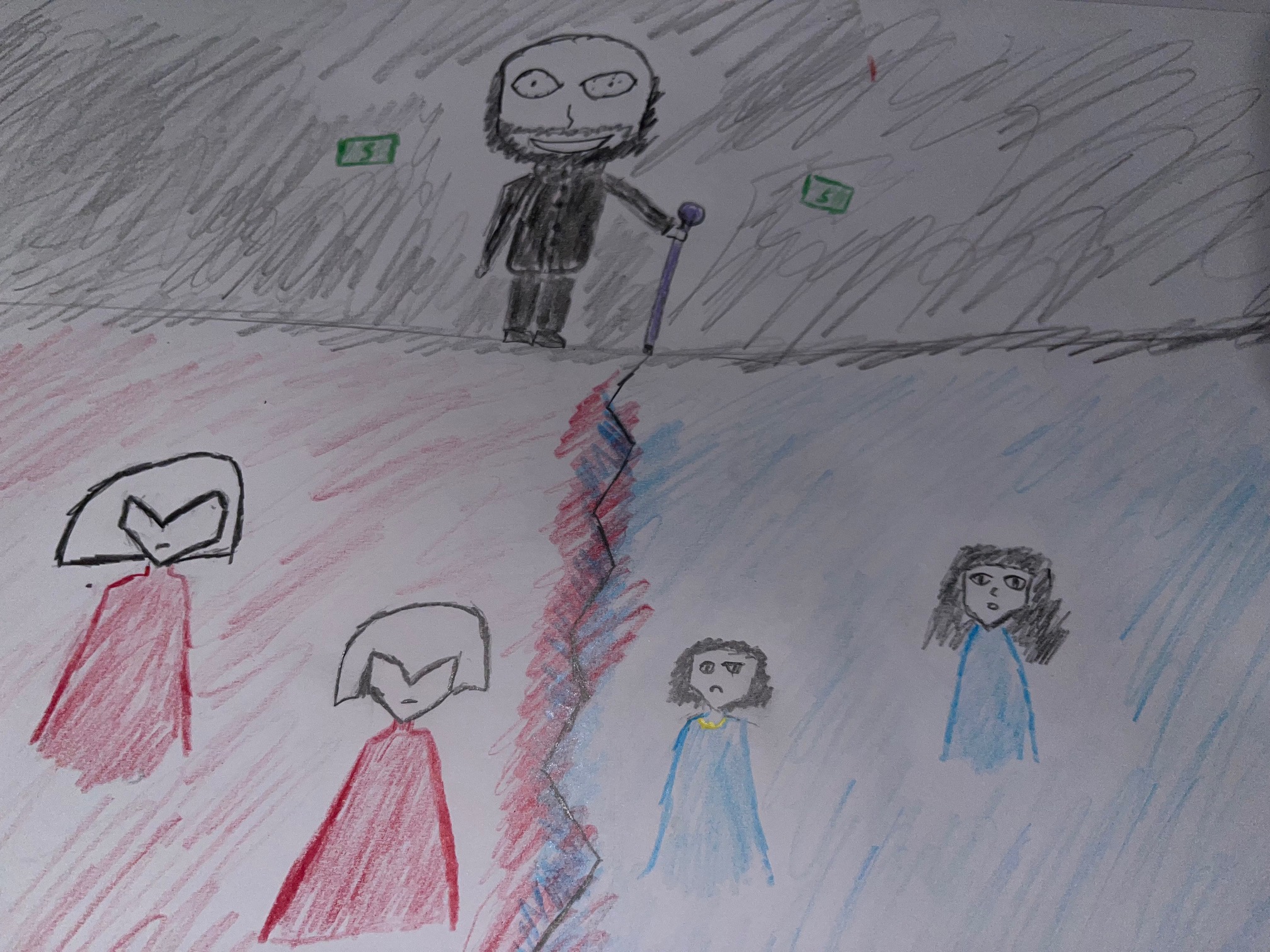 Art analysis: Everything about the handmaids and wives are conflicting, even the red and blue they wear clash. The black line through the middle represents their separation. However, towards the line, the clashing blue and red begin to blend together. Showing that despite what we see on the surface the wives and handmaids are in similar situations. The line toward the top separates the commander from both the wives and handmaids. Though the handmaids and wives are opposing, they are on the same level, the commander however is quite literally above them. There is no perspective to look through that puts the commanders on the same level as the handmaids and wives. I chose black to represent the commander because it’s a very dominating color. Unlike the blue and red, the commander’s black does not blend or fade. I wanted this show to show that he is without a doubt on top of the system. If you notice where the opposing line between the handmaids and wives start, it starts from the Commander’s cane. I did this to show the fact that the conflict between them started and kept going because of the commander. Overall my major goal was to show that the conflict between the handmaids and wives is just surface level, and that the real conflict is between all the women of Gilead and the commanders, who represent the system itself.
