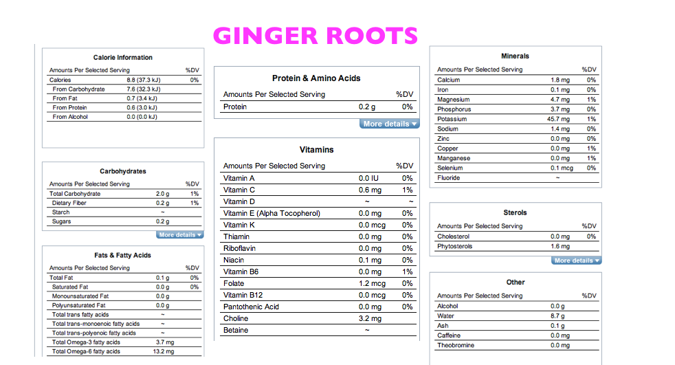 Facts and Analysis for Ginger Root, Raw." Nutrition Facts, Calories in Food, Labels, Nutritional