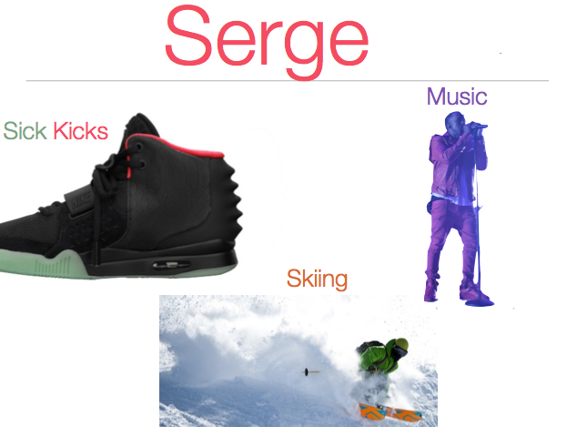 Yo: Me nombre es Serge. Me encanta el hockey sombre hielo. Me gusta los zappatos.