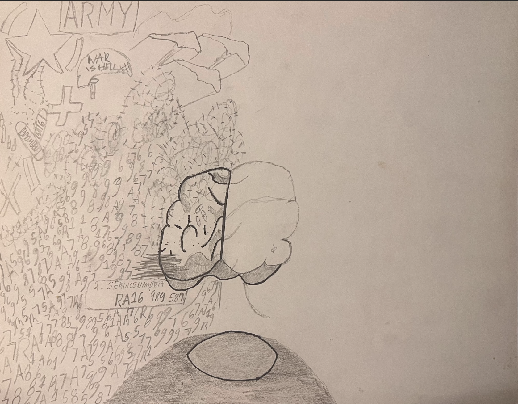 In the cuckoo’s nest, the mentioning of war and the implications it had on certain men intrigued my interest. For a man to come out of a war and be deemed “ok” as moments prompt us of the time period the book is set in. So the representation of fog makes for an abundance of visual material to work with as there is so much to be said about the fog. It could be the state of his mind being full from the pills & drugs. But I see so much that could be created from this scene as there is a calming bliss to it in my opinion. So the research I did on fog told me that fog is a visible aerosol consisting of tiny water droplets or ice crystals suspended in the air. ”Which I decided to go with a faded or not so drawn representation of the background because in his “fogged state of mind” everything he knows is suspended. But the things he sees in the fog as he tries getting past the pill’s effects makes for him to only end up in more fog which is why I put the machinery and control panels Bromden has seen through his times in the war and the ward which produce the combination in the art piece. We see as he doesn’t feel strong as he drifts in the fog that the ward has placed in the vents as the staff makes for reality to be shifted. Even as he wants to be above everything, he’s not there yet. That’s why I added his mind falling in the fog because of the ward’s readiness for him. “The numbers Murphy, THE NUMBERS ” this was something I acknowledged very early in the book as his involvement in the military was major. His mind is still there like it’s a switch, you can go there and be in the fog or be in reality as if you’re still lost in the world. So I added the split of activity in his brain, one side being in World war 2 still and then there is the careless nothingness of the ward. Two different worlds but they seem so far apart as there is no stopping his mind from wandering. More precisely as he’s stuck in the tradition of receiving the medicine and being gone he’s still the key to change. I included change in the visual piece because Mcmurphy is the one thing throwing the course of normalcy off as everything changed when he did. But Bromden picks this observation up as he doesn’t know what the staff may do with him and that’s why I included a blurry aspect that differs from the fog because you can see through fog, but you can’t see if your vision is just blurry.