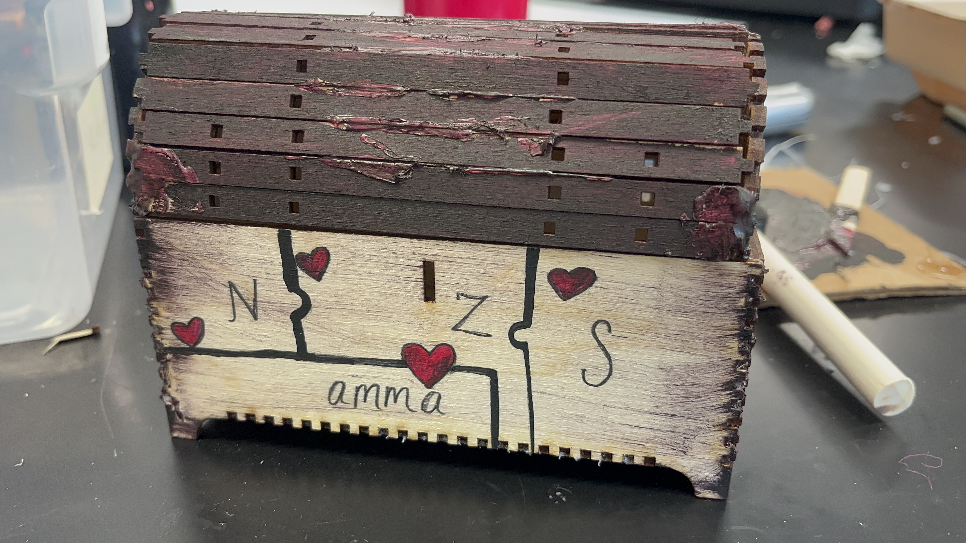 The thought of putting my own creativity that I use on projects outside of school was intriguing. The idea I committed to for my capstone project was a ‘Memories Chest’. The basic design was a chest that would be used to store memorable things, and it was a gift for my mom. It revolved around the engineering shop, and the tool my project was made possible by was the laser printer, which I was also really excited to use. At first, I thought about hand making the chest, but with research, I had to keep in consideration time and how difficult it would be. After laser cutting, making the chest was like a puzzle. It was interesting and fun to be handy and figure out the best way to put it together. I did accomplish getting the design I wanted at the end of the process, and it was like a clean canvas to work on further.