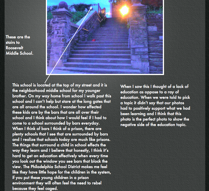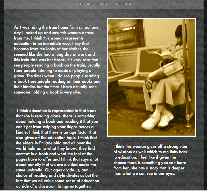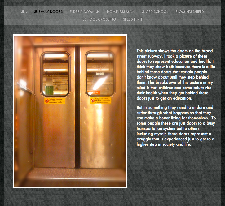 I think my favorite picture is the picture of the subway doors. I say that because I honestly feel like that picture says more than 1000 words. I think that anyone who steps behind those doors everyday has a lot going for them, it's very hard to put into words but so much goes on behind those doors and they travel all over the place, picking up many different people that its hard to draw one main point from those doors. That picture makes you think and reflect.