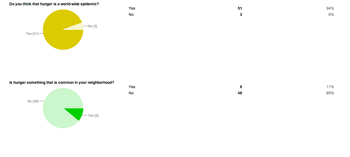 In my survey, I also questioned peoples’ opinion on whether or not they thought homelessness and hunger was an epidemic. More than 80% agreed and 91% of the people said that these conditions are common in their neighborhood.