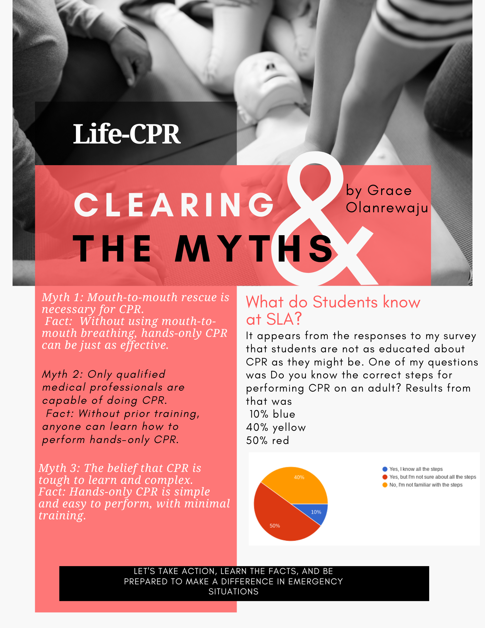 Throughout my senior year, I started a task to educate our school’s students about the knowledge of CPR and performing it. My capstone main focus was making and putting up two posters around the school. One poster was aimed at clearing up popular misconceptions about CPR among students, while the other offered a clear instruction guide with illustrations for doing CPR with just your hands.