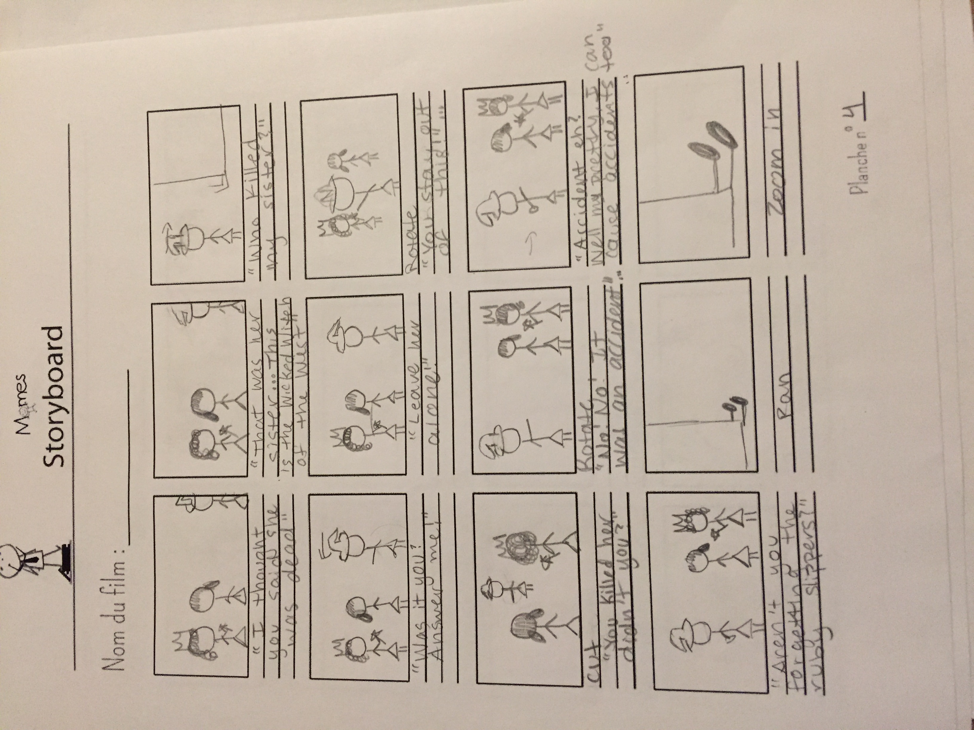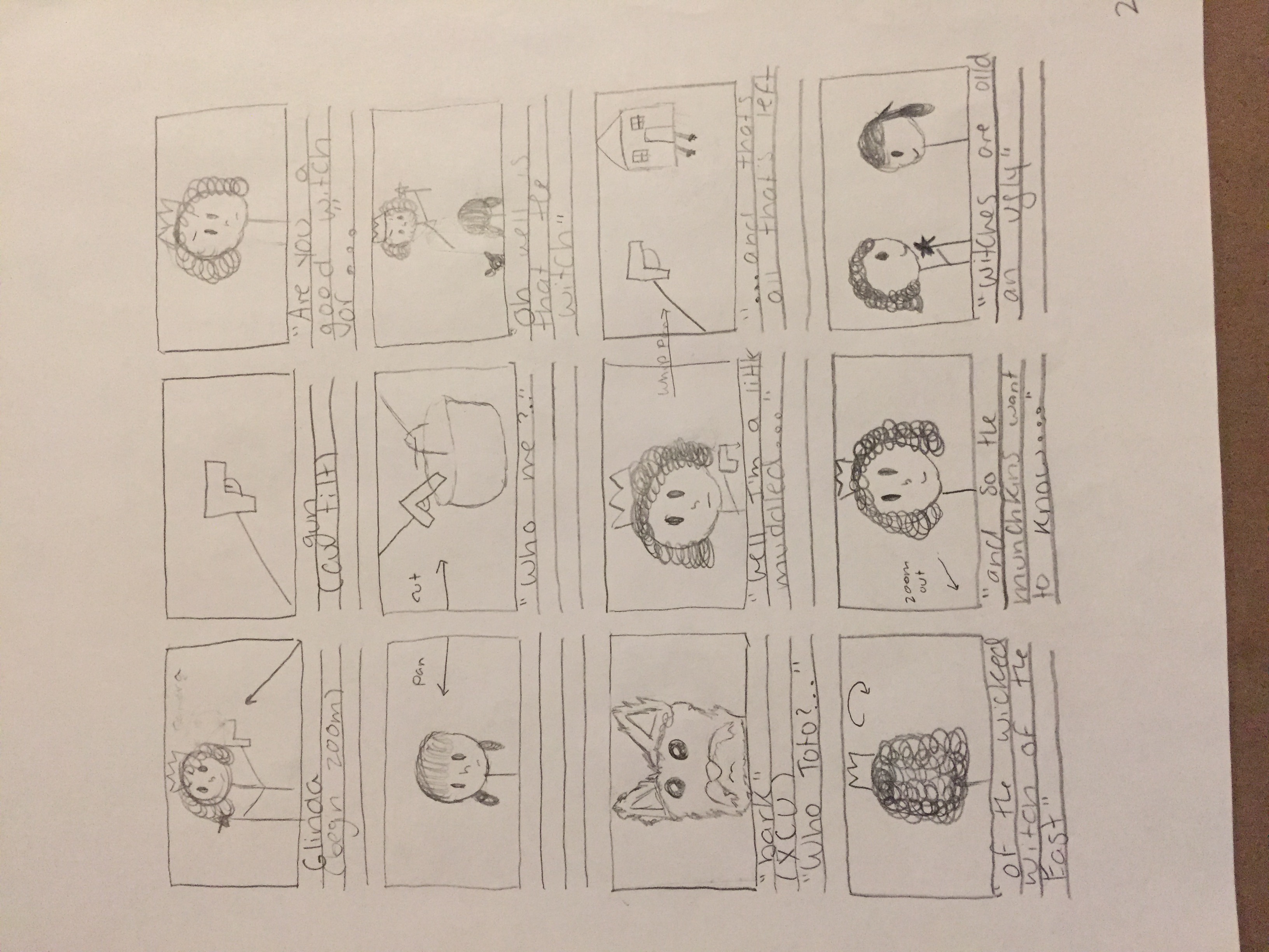 A major technique Bay is known for is the classic Bay shot. This shot has the camera spinning around the character as the character only moves vertically and often locks their eyes in one direction. The camera also spins upwards, showing the detailed backgrounds and making the character smaller. This is in every Michael Bay film and we felt it was absolutely necessary to include it. This kind of shot is really complex, as an abundance of technology is needed in order to make this shot seamless. This shot is what inspired us to change The Wizard of Oz into a Bay film, as we felt that the incorporating the Bay shot when Dorothy first lands in Oz could really showcase how alone and lost she felt in this empty city. We also made the backgrounds in Munchkinland more detailed in our drawings during this Michael Bay shot. However, we changed the colorful towers and twisty staircases into more of a hut and village set up to create a different tone for the film. We thought it would be too cheerful if we kept the setting exactly the same, and wouldn’t really convey the same feeling as the rest of Bay’s movies.