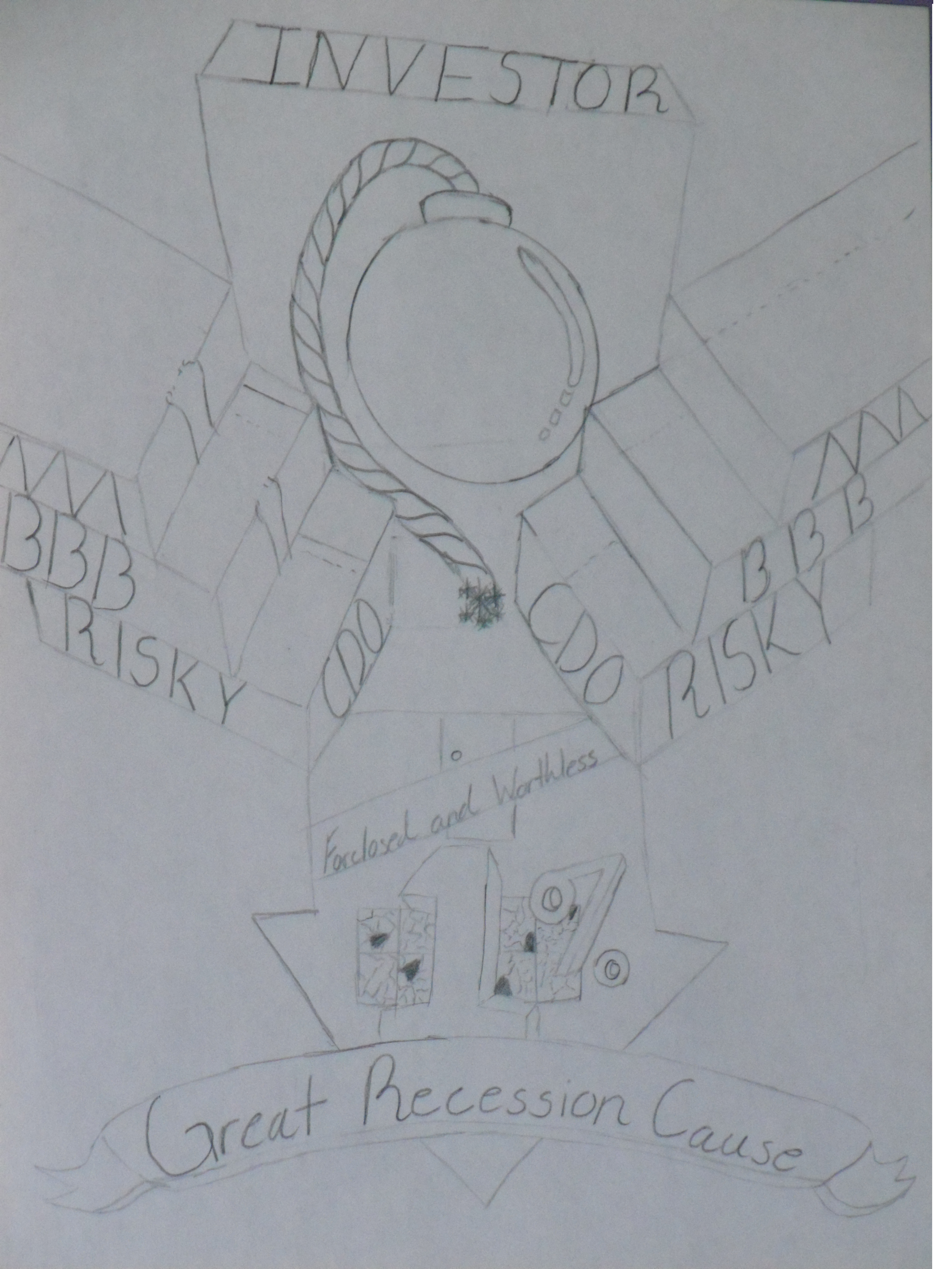 In this picture: You can see an upside-down House which represents the the decreased cost in Houses. Then there is the bomb between the C.D.O's which show the risk and eventual explosion (the bad one) of the housing market.
