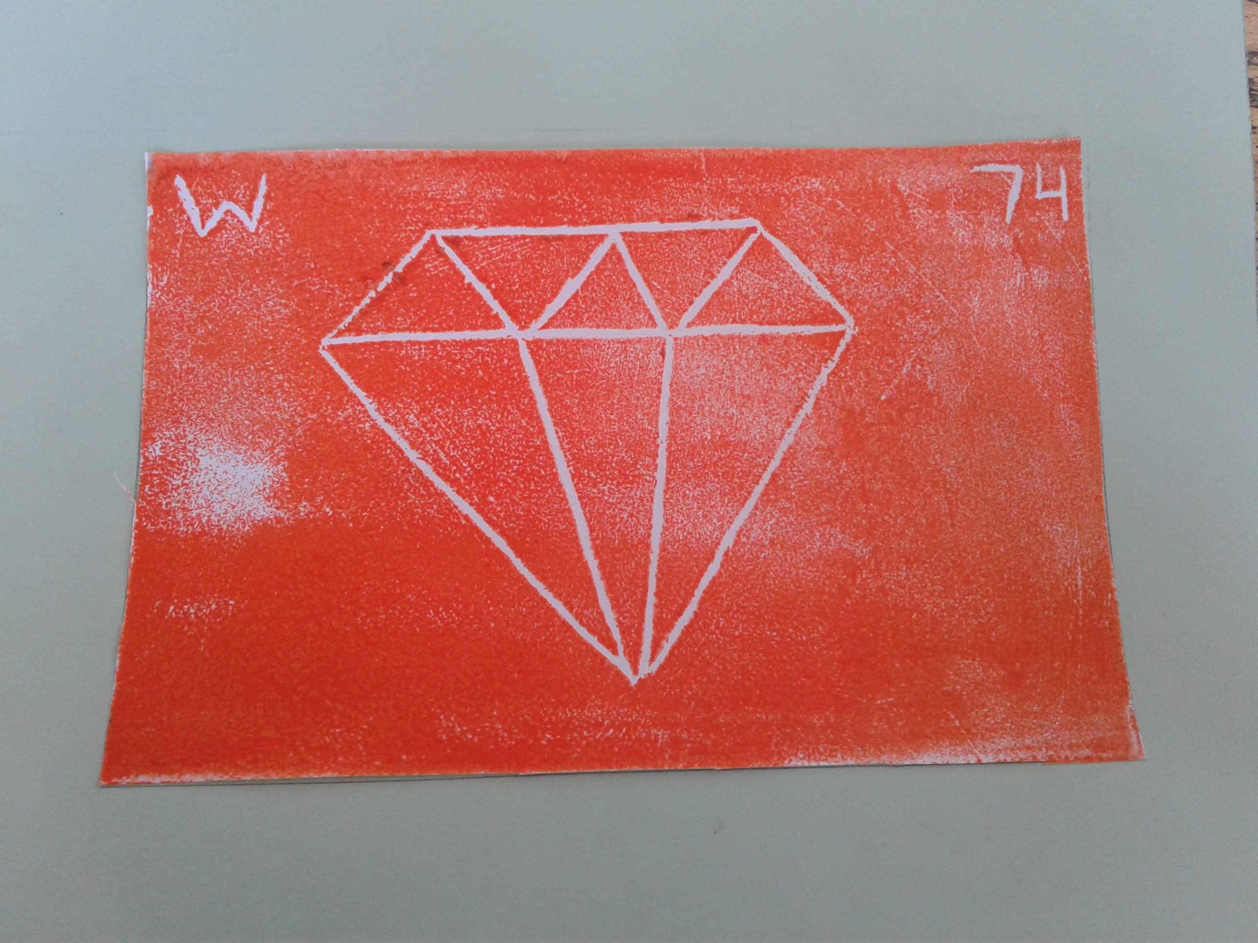 There was a lot of process when doing this print. The first process was that drawing the diamond was hard because I have to make it perfectly semetrical. Then when it was time for printing, it was easy because there was no need to turn it backwards. While drawing it on the foam, the only thing that need to be backward was the number and the letter. While printing it, I evenly rolled the paint and then rolled it to the foam. After that, I layed a paper on top of it and then evenly rubbed it on to the paper. After that, your picture will be perfect.