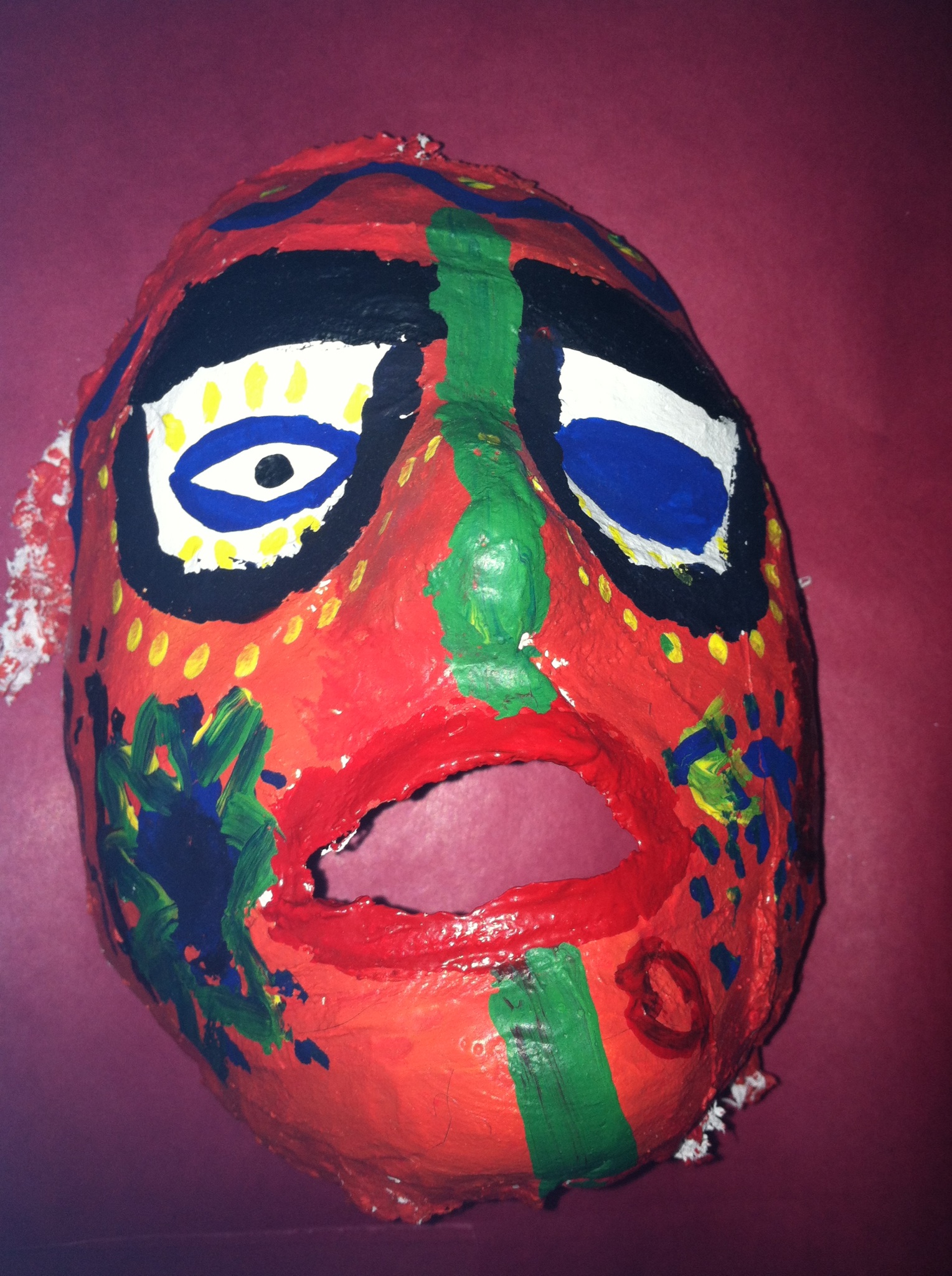 3. First I did research on sugar skulls themselves and what they are used for. I was able to get a general understand of what they should look like. I also did a couple of sketches of the skulls. My second step was to find some one that would let me plaster their face because I did not feel comfortable doing it. Thankfully, Wynn was able to help me out and let me mold his face with the plaster. The first step to this was to gather all the materials (hot water, straw, paper towels and plaster), then I had to wet stripes of the plaster in the hot water and mold it to his face. It was necessary that I put a lot of layers on his face so that the masks keeps it shape. The straw was used so that Wynn was able to breathe during the process. After that was done I let my plaster dry over night and Wynn washed off all the plaster from his face. The next class period I painted my mask black with white designs.