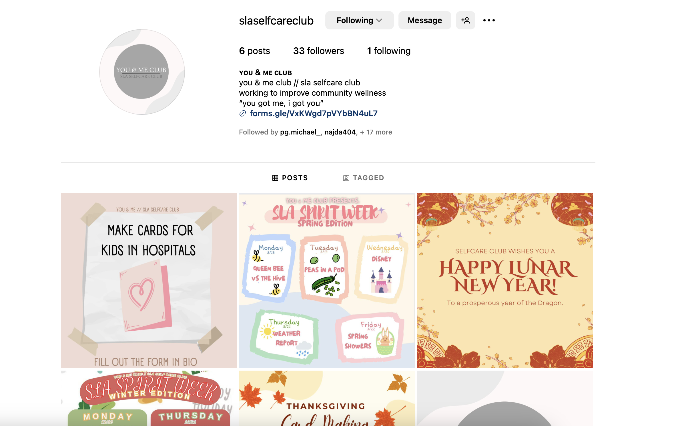 Below shows he SLA Selfcare Club instagram page where new events would be posted. Along with the SLA Selfcare Club Calendar with all the events hosted. This is the link: https://docs.google.com/presentation/d/1p87XrqfxoCHvbkETzEADeGxpxpqicalJGKCD3duzboQ/edit?usp=sharing