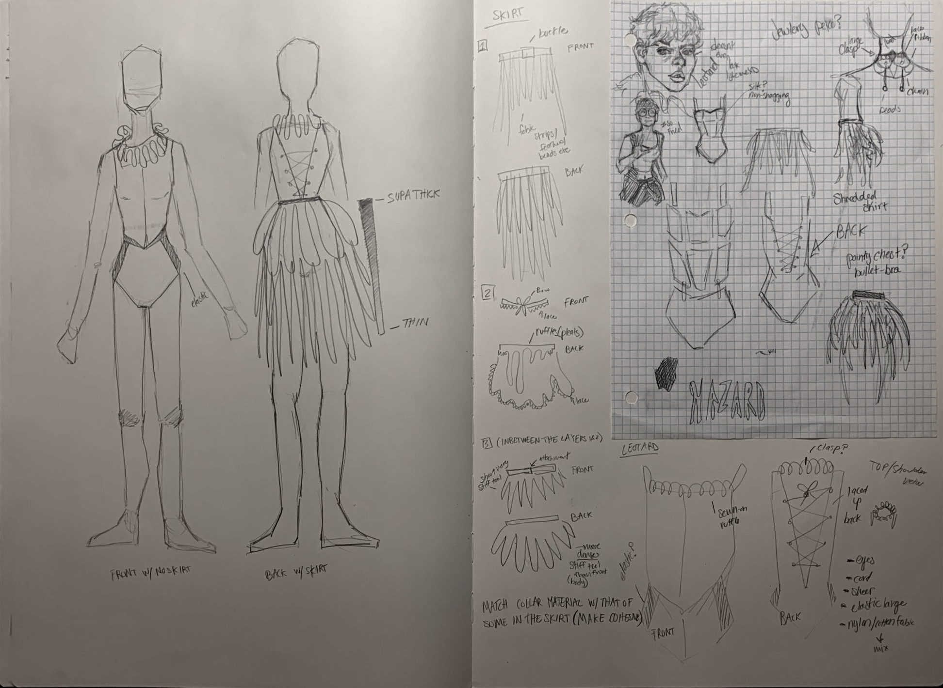 Due to overestimation of my ability to use time wisely, I was only able to complete about half of what I set out to do. I will be presenting two designs for a costumes as well as one fully completed costume. Through these designs you can see how they were made for their greatest advantage to be on screen.