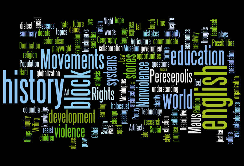 Art, English, Plays, History, World, Dance, Poetry, Diversity, Religion, News, Change, Revolution, New, Beginning, Corruption, Government, Pain, Torture, Genocide, Survival, Understanding, Slavery, Trial, Judgment, Stereotypes, Hope. These words have created my 10th grade education.  I have gone through anything but a normal English and History courses. Many of my friends out side my own school have told me stories of the many tests and papers they have had to write over the year. When I ask them what they remember about the projects they needed to do, or the papers they needed to write they cant remember. When I tell them about my projects and number of pages I have done this year they cry for me. I have had a most unorthodox year with Mr. Block.