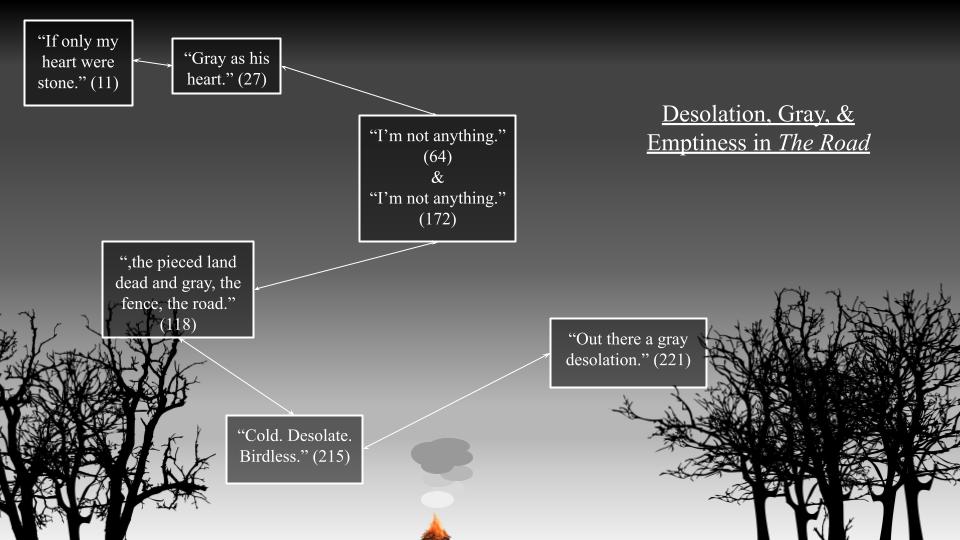 The image shows a truck, and the boy was terrified of leaving the “important things the man and the boy left behind. We have decided to change the size of things to show their importance. The tomato can that they left would have been very beneficial to their survival since they always seem to run out of food. The father decided that it would be safer to leave the barn that had food instead of staying at the risk of the owners coming back. The use of “fire the boy was carrying” changed the whole story. If something bad was going to happen, they would say they would make it because they were “carrying the fire.”. This shows that the fire was purely imaginary but had a major impact on the mental health of the man and boy, helping them persevere through the days they spent traveling. Like the fire, the father and son’s belief in God is challenged many times throughout the book. The most memorable time is on page 170, when they meet a blind man who starts to converse with them, leading to a conversation about God going, “I guess God would know it. Is that it?” The blind man then says, “There is no God.” In response, the man says, “No?” getting the response, “There is no God, and we are his prophets.” In the image, the reader can see all the different components that play a role in this book, like the main ones being the fire and the flare gun, since they were great turning points and stopped with the characters throughout the book. The road obviously shows the gloomy setting, and we decided not to color it in to really show how dark and gloomy the setting is by showing little to nothing in dark color or color in general. The mountains in the background also relate to the setting because it shows the rough conditions that they were in since it was cold and we can tell that by the snowy trees mentioned in the beginning of the book.