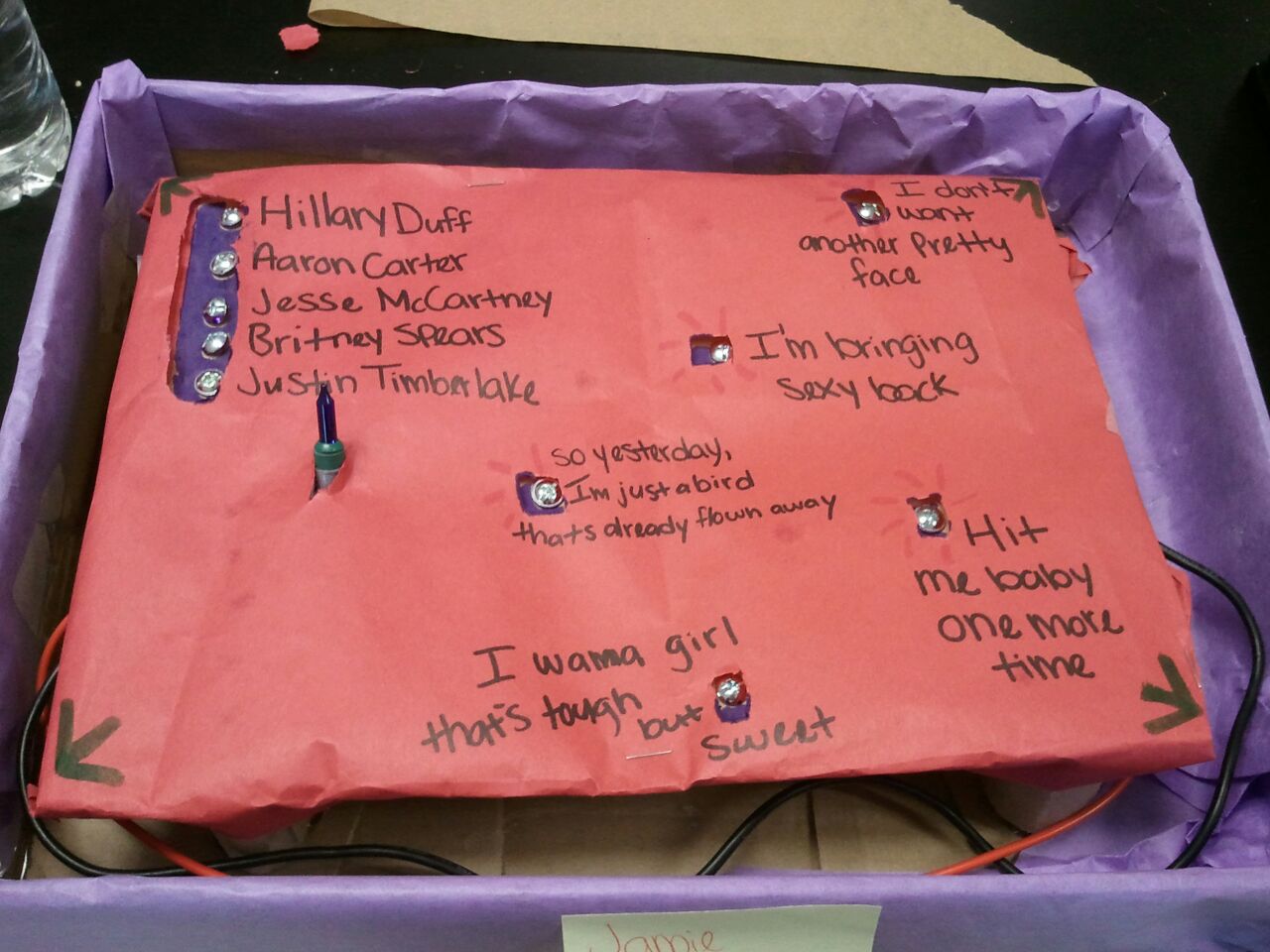 We decided to do our project about music because we felt like everyone can connect with music. We took music from 1990's. During the 1990's everyone was into bright colors, sticking out and being unique, therefore we made our project purple and red with a blue light bulb.