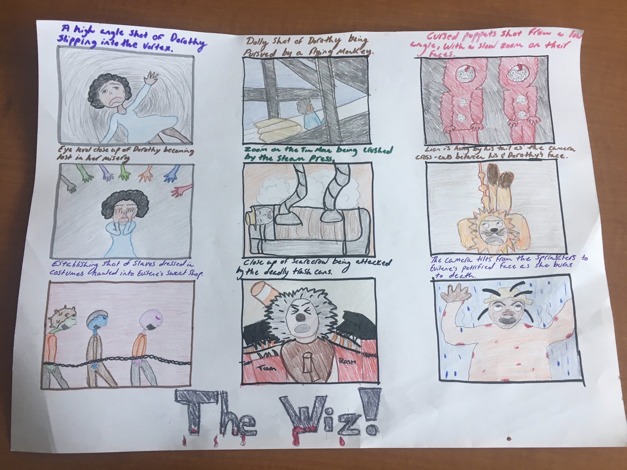 For our final film project, Kara and I decided to take on a classic, “The Wiz”, and create a horrific rendition of the original plot through a storyboard trailer. To do this, we had to incorporate things that are mainly seen in movies under the horror genre. This meant finding parts of the movie that had a lot of bottom angles, eerie non-diegetic sound and scenes that either foreshadowed or included the main characters encountering danger. This was a challenge considering the original nature of the movie, but knew that there were still sustainable parts that would be effective when put together. The majority of the movie uses high key lighting, colorful setting and upbeat non-diegetic sound. We were able to take the scenes that embodied darkness with the menacing costumes, emphasizing the horror in Dorothy and her friends’ faces while connecting it to the harrowing causes. Camera angles and techniques that are commonly used in horror movies include the birds eye/high angle shot, which makes the subject seem small and vulnerable, Close ups to display the emotion and capture detail, tracking shots during chases, a handheld camera shot and point of view shot to give insight to what the character is experiencing. We found a lot of these techniques in the scenes we chose, even before doing more research on what was commonly used in the genre. Depending on the character, There will be more of one technique used than the other. For main characters such as Dorothy and Evilene, there were many close-up and eye level shots, or establishing shots when they would change setting.