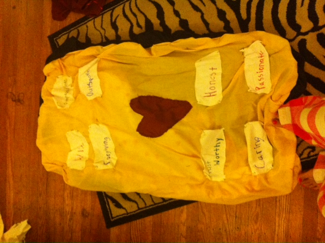 yellow sheet, white sheet, red fabric, shapies etc. Then I came up with the