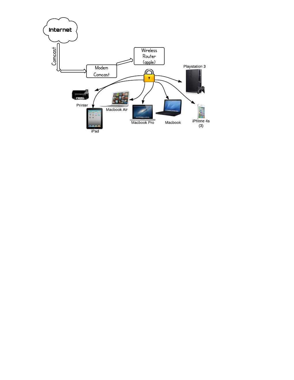 My local area network has many things connected to it. I have a lot of devices in my house that are connected to the wireless internet. The devices are three iPhones, an iPad, one Macbook, one Macbook Air, one Macbook Pro, a Playstation 3, and a printer. Comcast is my internet provider, so all of those devices are using Comcast's internet.