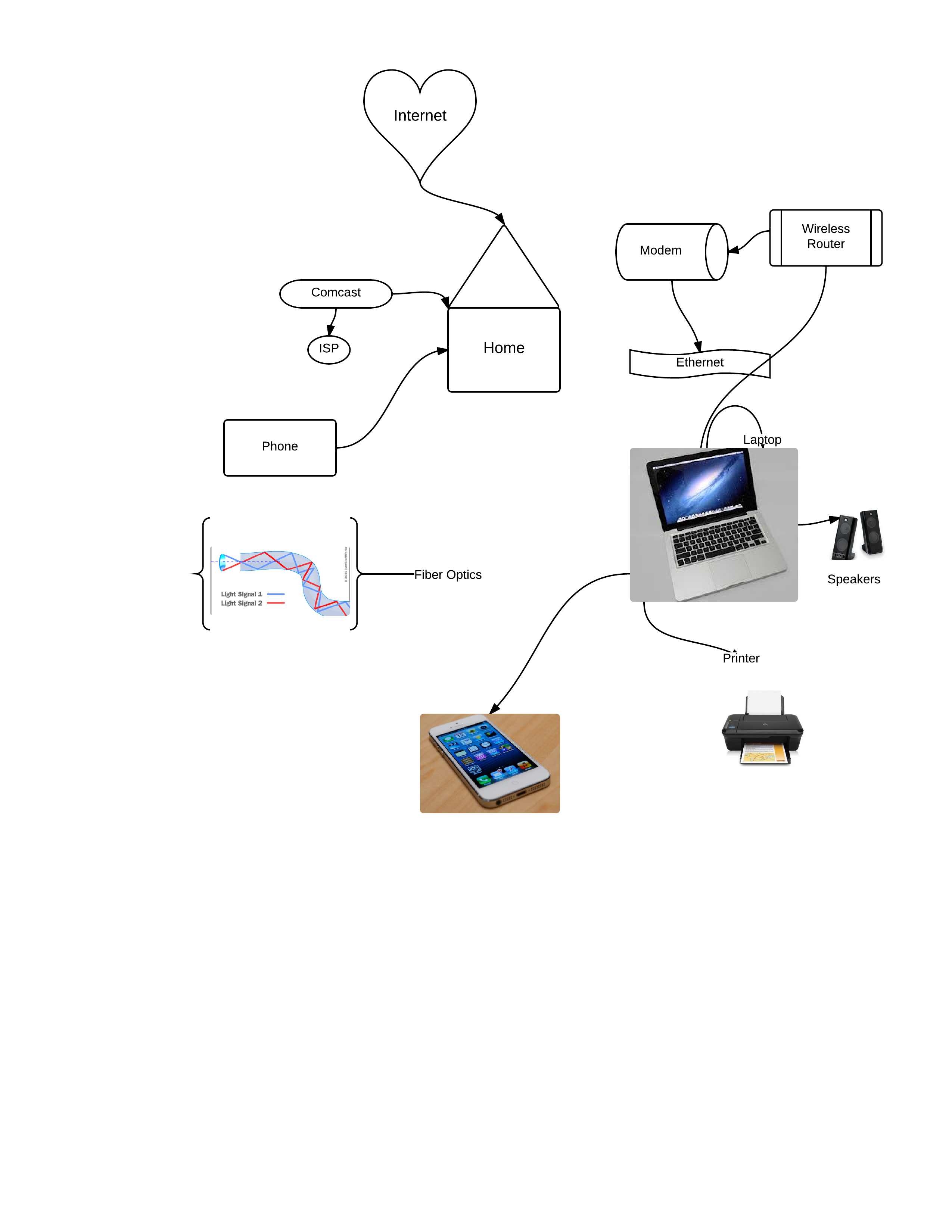 This is my home network. My homenetwork is very simple. It is connected to only two laptops and a phone. The laptops are wireless and are far away from my modem and router which are in the basement. I was able to learn that all providers of internet give very different services with different quality. Also where you locate your router is crucial for your connection.