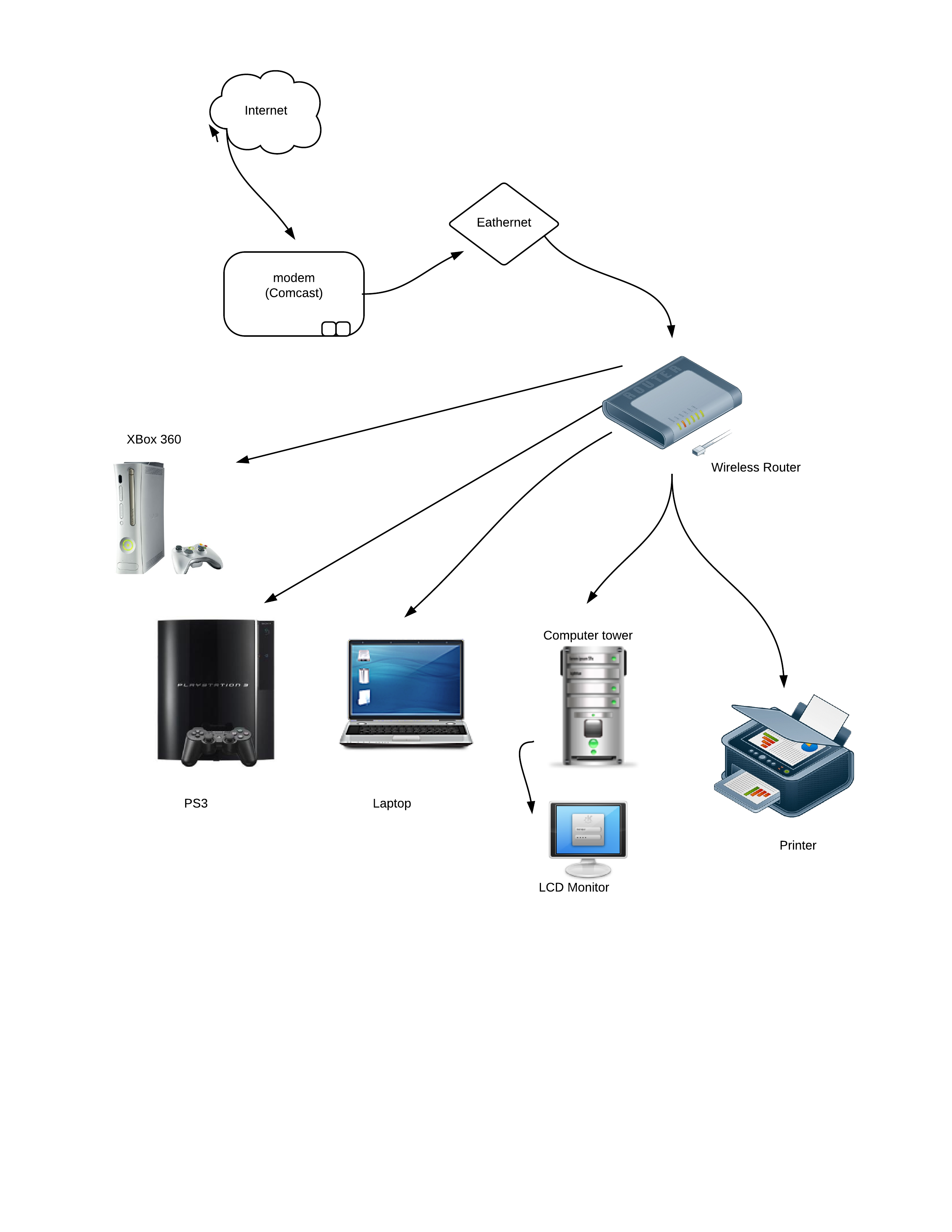 This is my Home Network, or my LAN. Consisting of both wireless, and wired connections, I have a total of six devices on my network, including a printer, two gaming consoles, two laptops, a smart phone, and one desktop computer. The network is controlled by a modem, which then powers the wireless router, as well as the wired connection to the desktop. Simply speaking, LAN's are pretty complex!